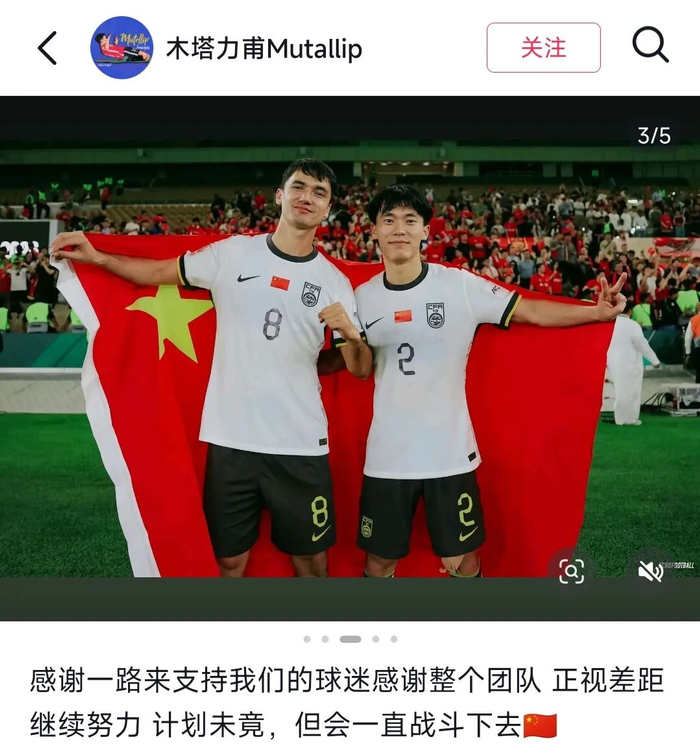出场较少的木塔力甫仍在为迈进国足大门而努力。“这个梦想还没有实现,因为我现在踢的是U系列国家队的比赛,要想成为成年国家队的一员,我还得继续努力。”2024年卡塔尔U23亚洲杯暨巴黎奥运会亚洲区预选赛开赛前不到一周,因伤退赛曾让他备受打击;两年后在沙特,他第二次为这项洲际大赛而全力备战,并且如愿以偿。