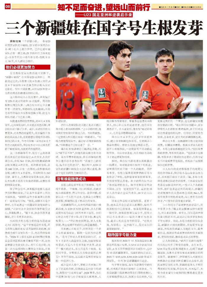 撰稿/左瑞  三个新疆小伙,恰好“覆盖”了U23国家队的中前后场三条线:22岁的中锋拜合拉木·阿卜杜外力来自伊犁,此前已在成年国家队占有一席之地;21岁的中后卫吾米提江·玉苏普只比中场木塔力甫·依明卡日大18天,两人都来自喀什。