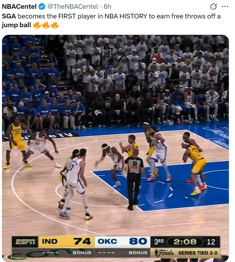 NBACentel写道:“SGA成为了NBA历史上首个通过跳球来得到哨子的球员”。