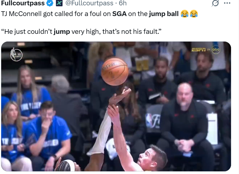 Fullcourtpass写道:“TJ·麦康奈尔在跳球时被SGA判罚了犯规。‘他(SGA)就是跳不高,这不是他的错。’”