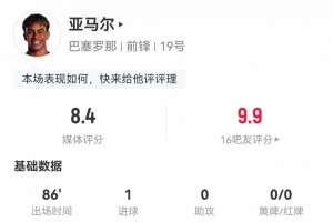 体育资讯4月10日讯 欧冠1/4决赛首回合,巴萨4-0多特。亚马尔首发86分钟,主动请求换人,球员全场重点数据如下↓